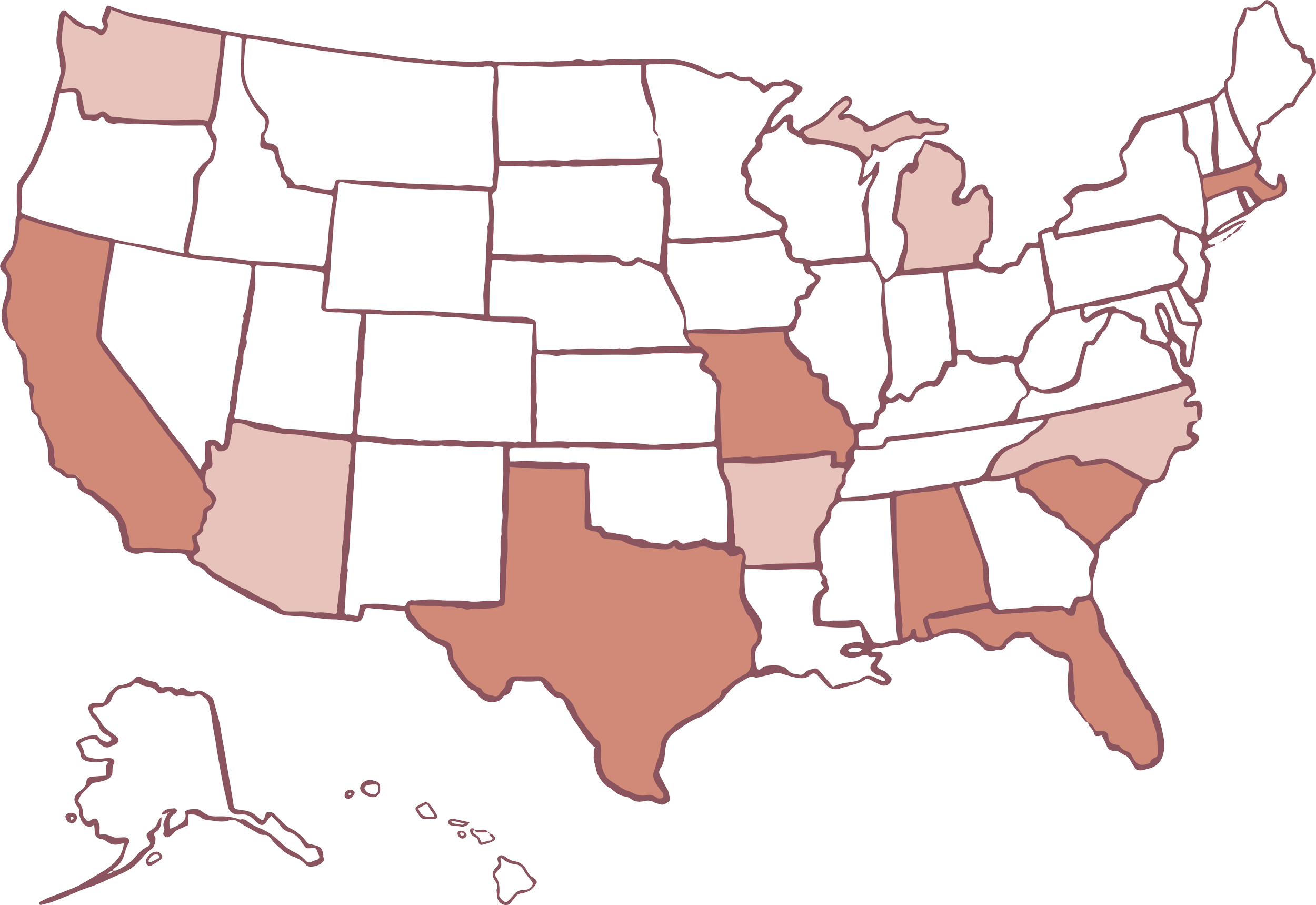 Missouri, Arkansas, Florida, California, Texas, Alabama, Arizona, North Carolina, South Carolina, Michigan, Massachusetts, Washington & Internationally in Mexico, Sweden and Canada.